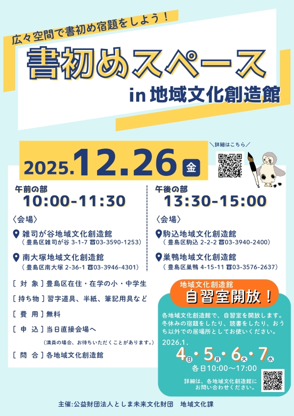 当日直接会場へ(先着順) 2025年12月26日(金曜) ①10時から11時30分 ②13時30分から15時 令和7年度 書初めスペース in 地域文化創造館 地域文化創造館・共通その他講座・ワークショップ子ども・親子無料