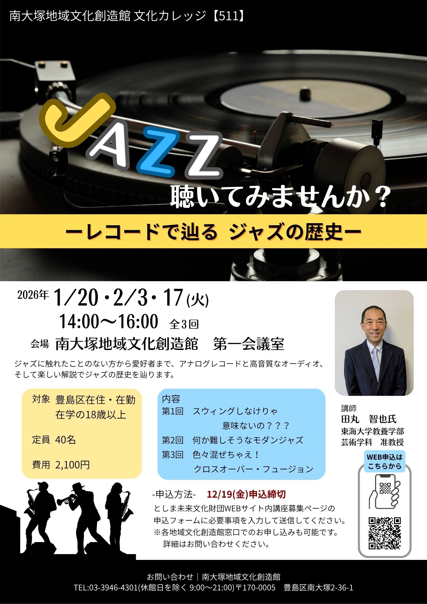 募集中 12月19日締切2026年1月20日、2月3・17日 火曜 14時【全3回】 【511】JAZZ聴いてみませんか? -レコードで辿るジャズの歴史- 南大塚地域文化創造館文化カレッジ講座・ワークショップ区民参加参加する