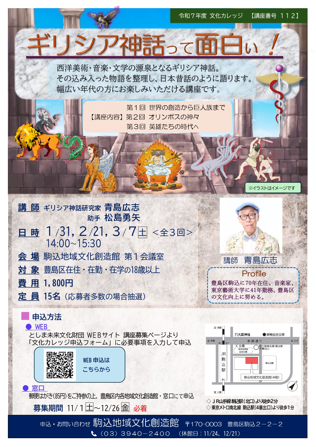 募集中 12月26日(金曜)締切2026年1月31日・2月21日・3月7日(土曜) 14時 から15時30分【全3回】 【112】ギリシア神話って面白い! 駒込地域文化創造館文化カレッジ講座・ワークショップ区民参加参加する